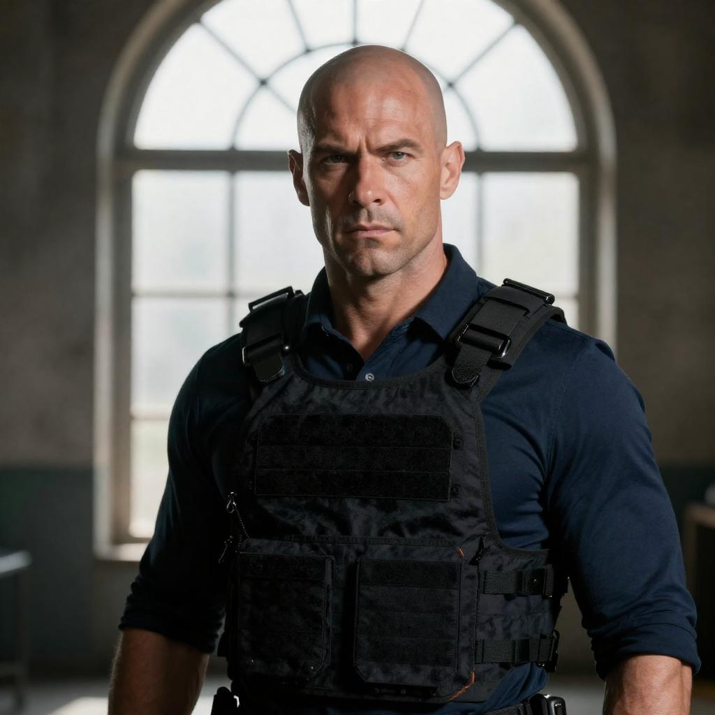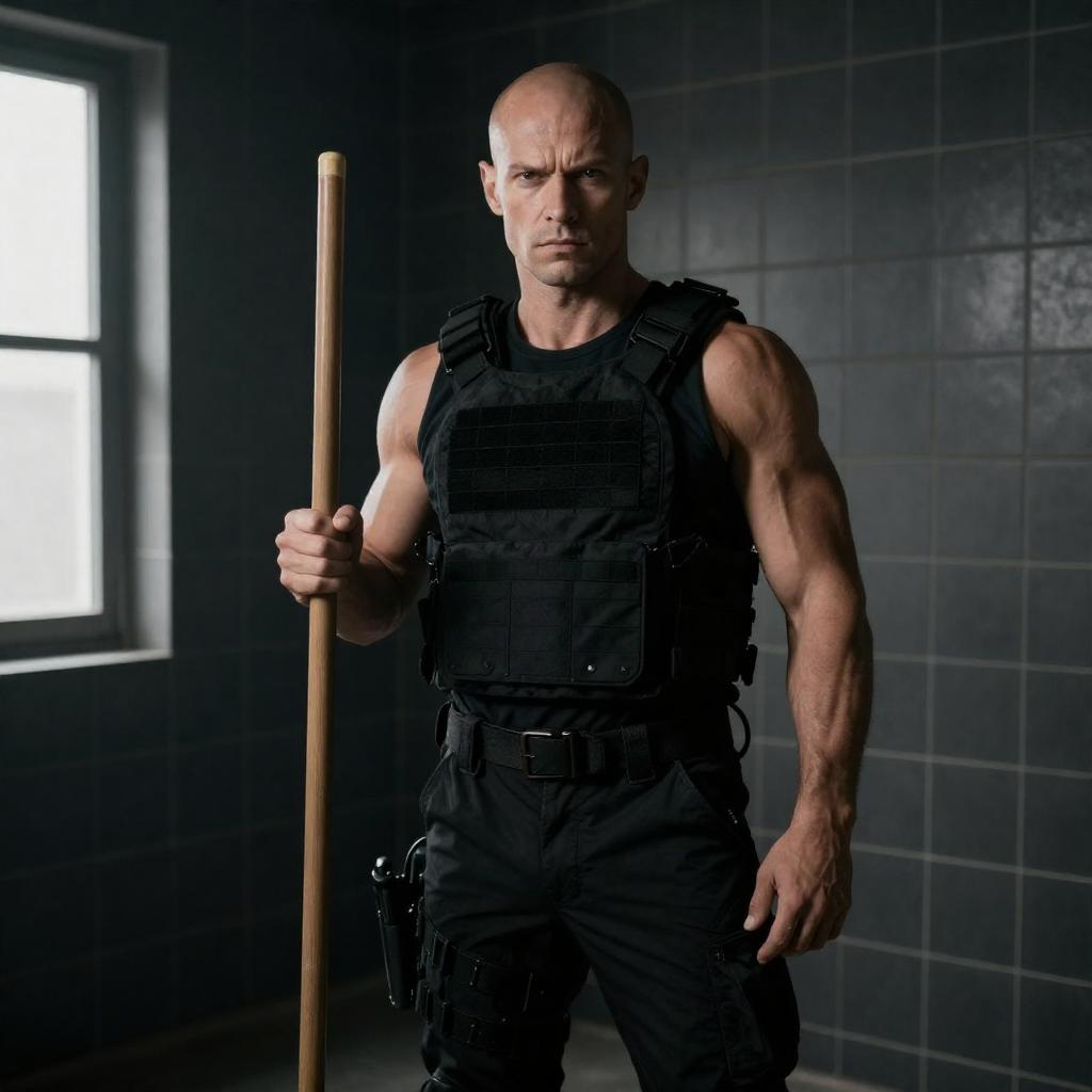 Muscular bald man in white tank top and camouflage pants, holding a large gun diagonally across his chest. Intense expression. Industrial background with dark, illuminated structures. Dim green and orange lights. One person. Right arm raised.