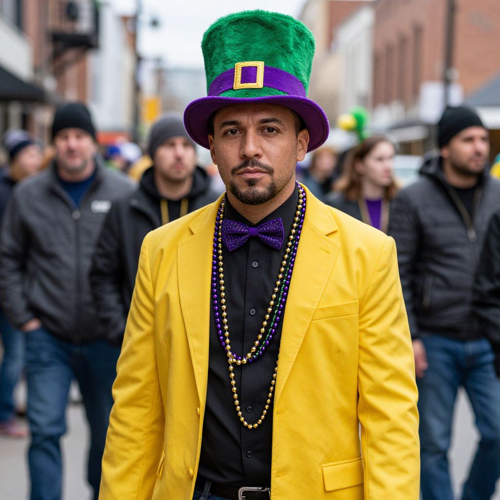 Mardi Gras Attire Male Costume, dressed in a yellow jacket and a green and purple hat