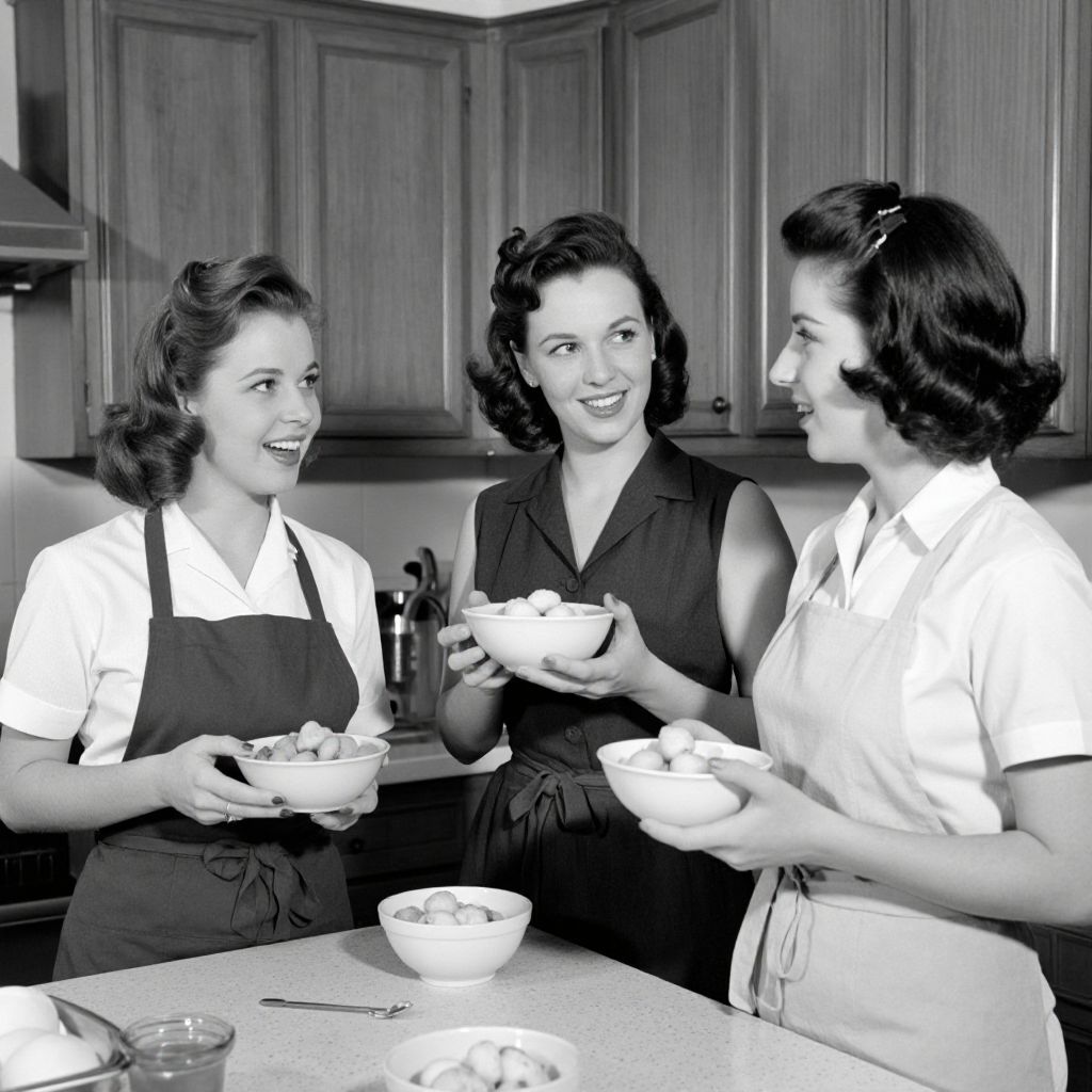 Black and white photograph of three smiling 1950s-style women in aprons, standing around a kitchen counter. They're all holding bowls filled with small, round food items. The woman on the left has wavy hair, the middle woman has a dark sleeveless top, and the right woman has short, curled hair. The background has wooden cabinets. The women appear to be happy and engaged, chatting while working together.
