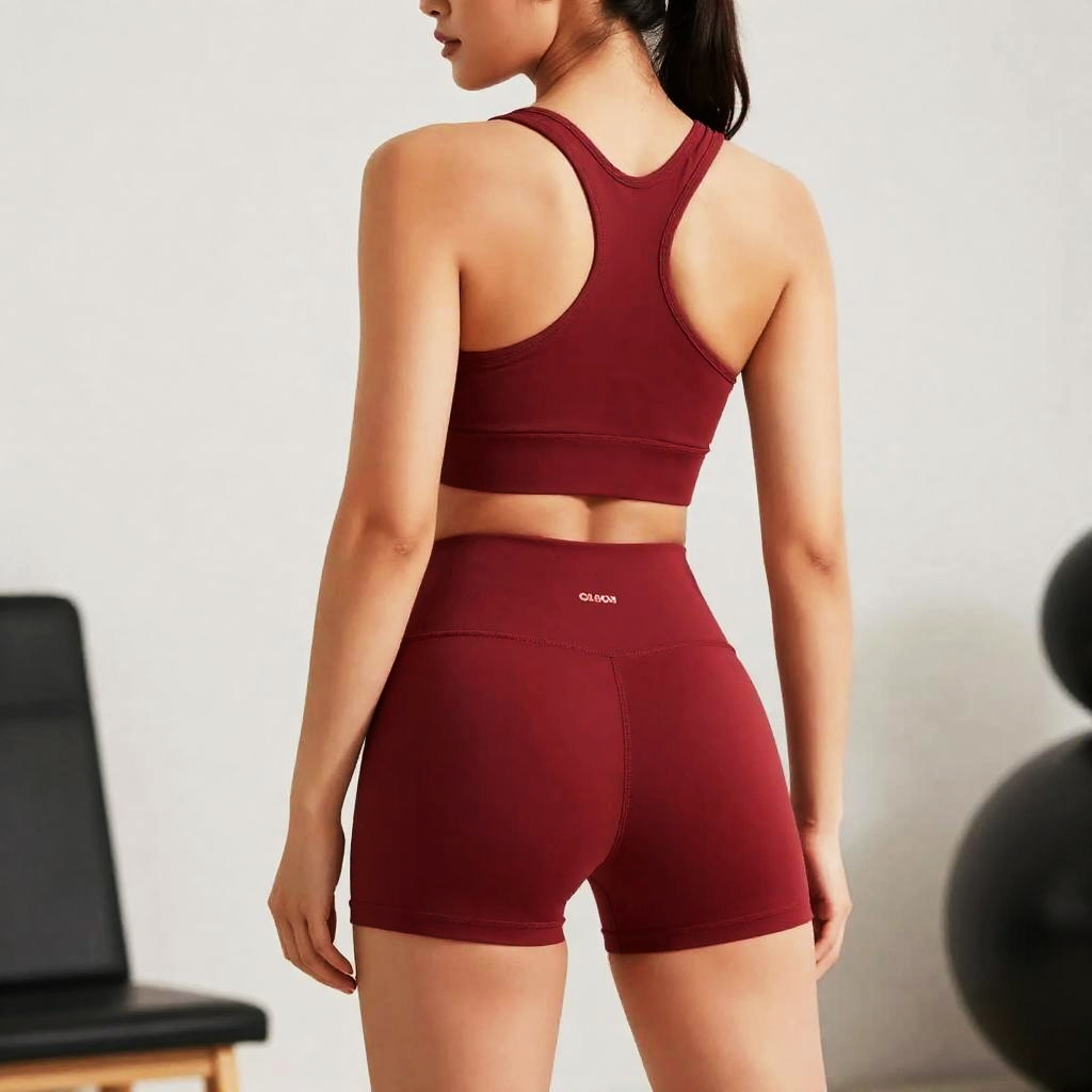 Gym Apparel, woman in red sports bra top and shorts in gym