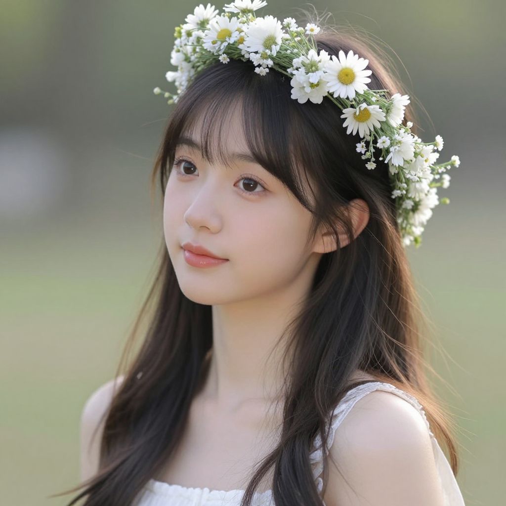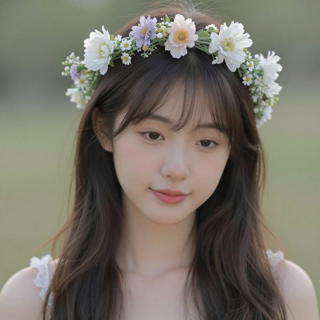 Captured in a timeless moment of serenity, the young woman adorned with a delicate garland of flowers embodies the ephemeral beauty of youth, her gentle gaze and soft blush hinting at the quiet contemplation of life's transient joys.