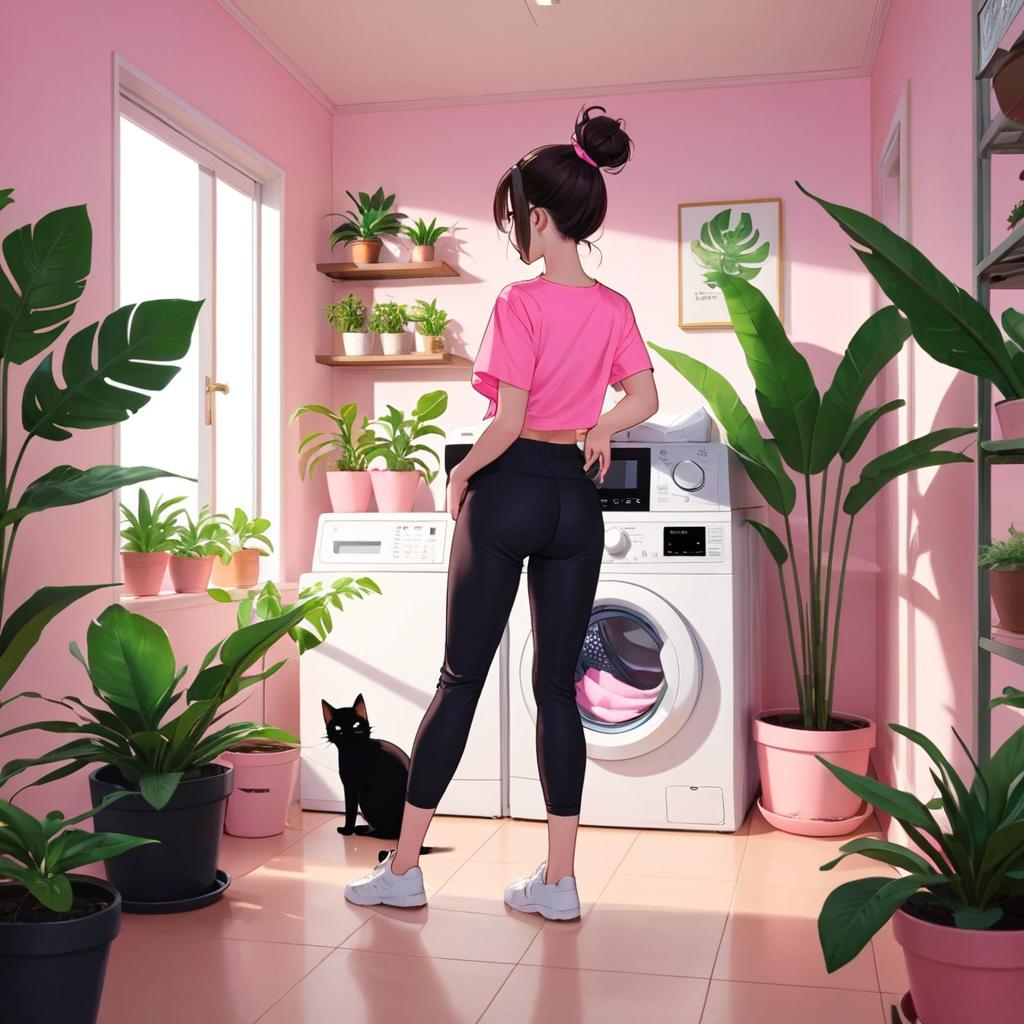 A digital illustration of a young woman with dark hair in a bun, standing in a sunlit pink-walled laundry room. She wears a pink crop top, black pants, and white sneakers. Her back is to the viewer, facing a front-loading washing machine. Surrounding her are various potted plants with large green leaves on the floor and shelves. A black cat sits near the washing machine. The room has a bright, airy feel with sunlight streaming through a window on the left. The floor is tiled in light pink.