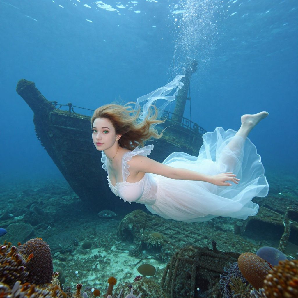 Photograph of a fair-skinned, brown-haired woman in a flowing white dress, swimming underwater beside a sunken, rusted shipwreck surrounded