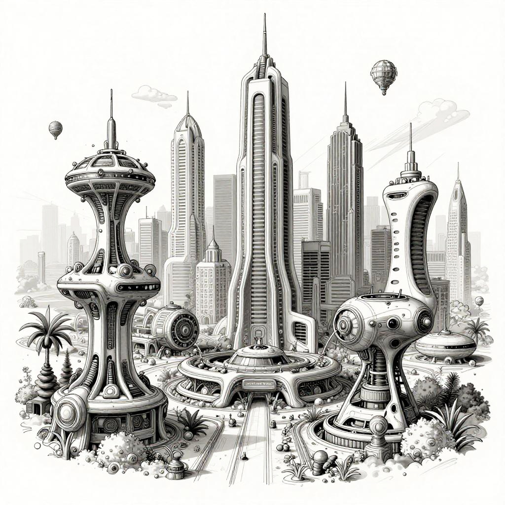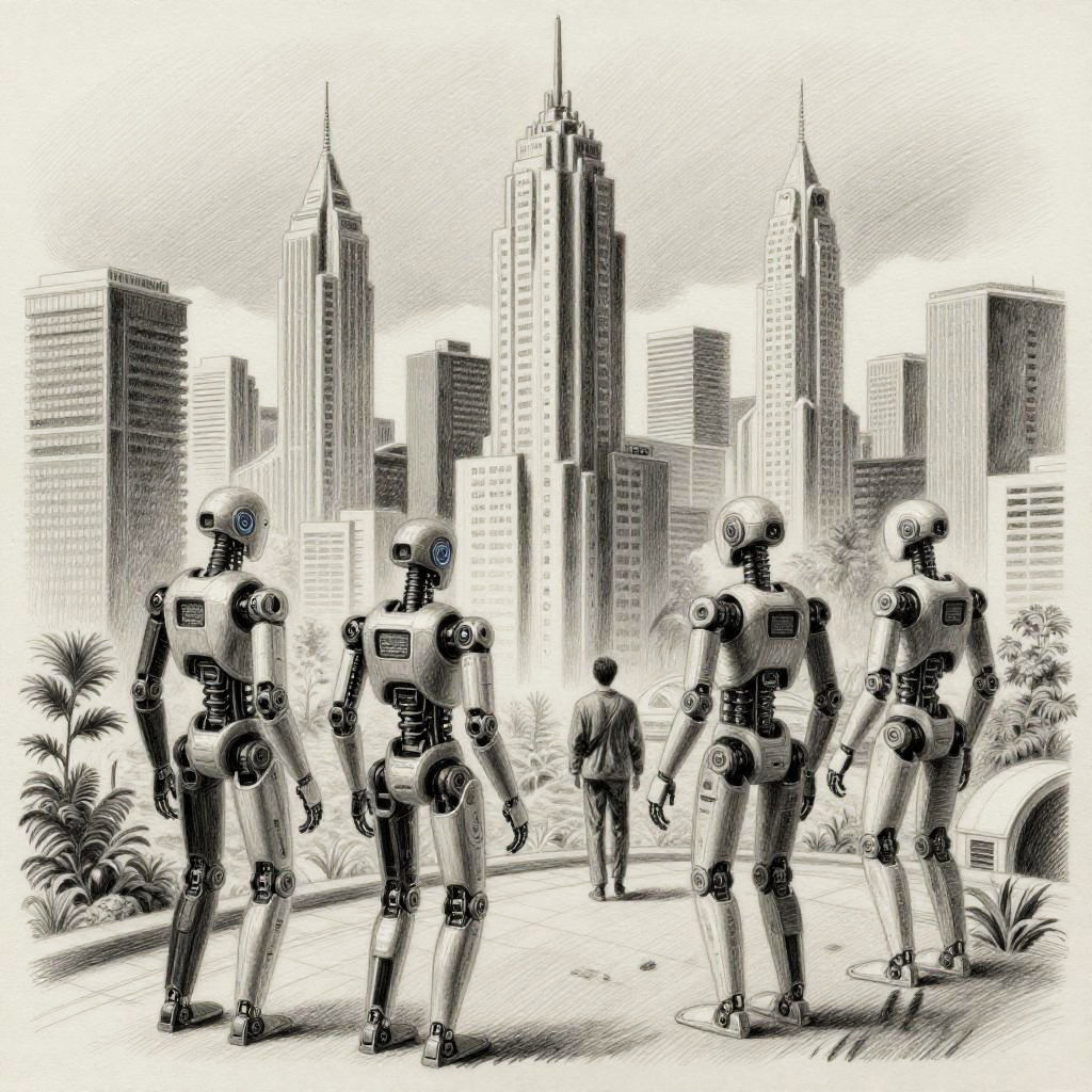 Ai pencil drawing of a futuristic cityscape blending technology and nature, intricate detail showing advanced AI robots interacting with humans, shaded with soft pencil strokes on textured paper, monochrome style capturing depth and contrast