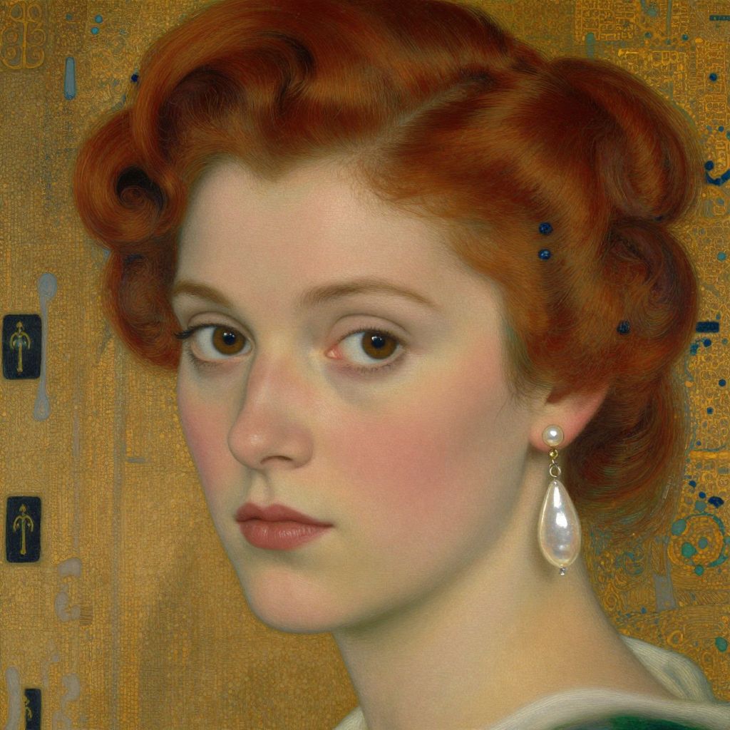 A woman with red hair and pearl earrings, depicted in a style reminiscent of Gustav Klimt.