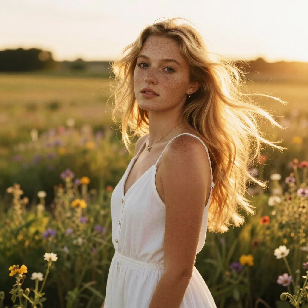 Blonde with freckles, outdoor scene in golden hour, wind blowing through her hair, freckles glowing under warm sunlight, wearing a casual white dress, wildflower field background