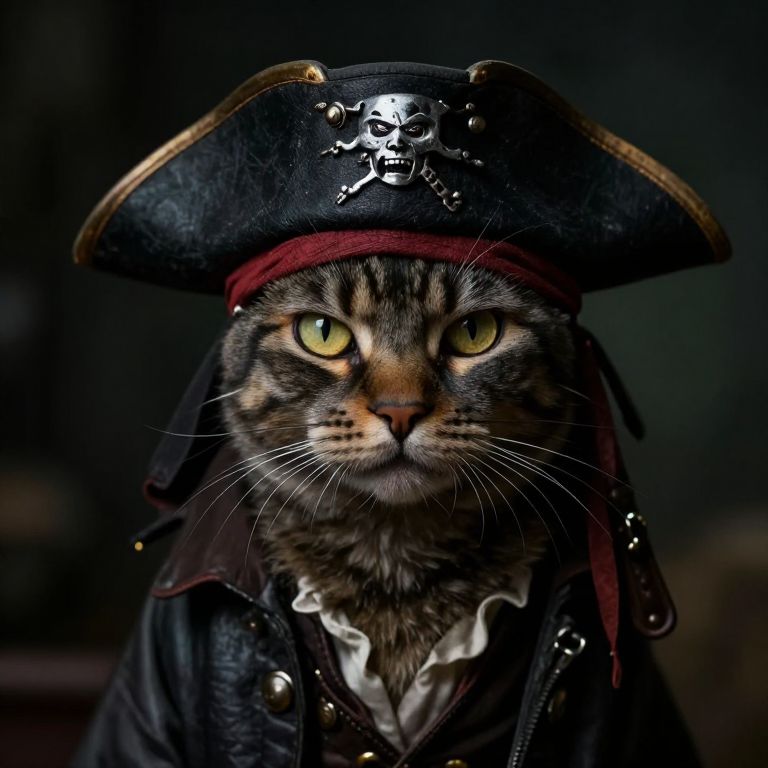 Special Effects a cat, as a pirate, ultra realistic, dark look, threatening, dark atmosphere, ultra detailed,