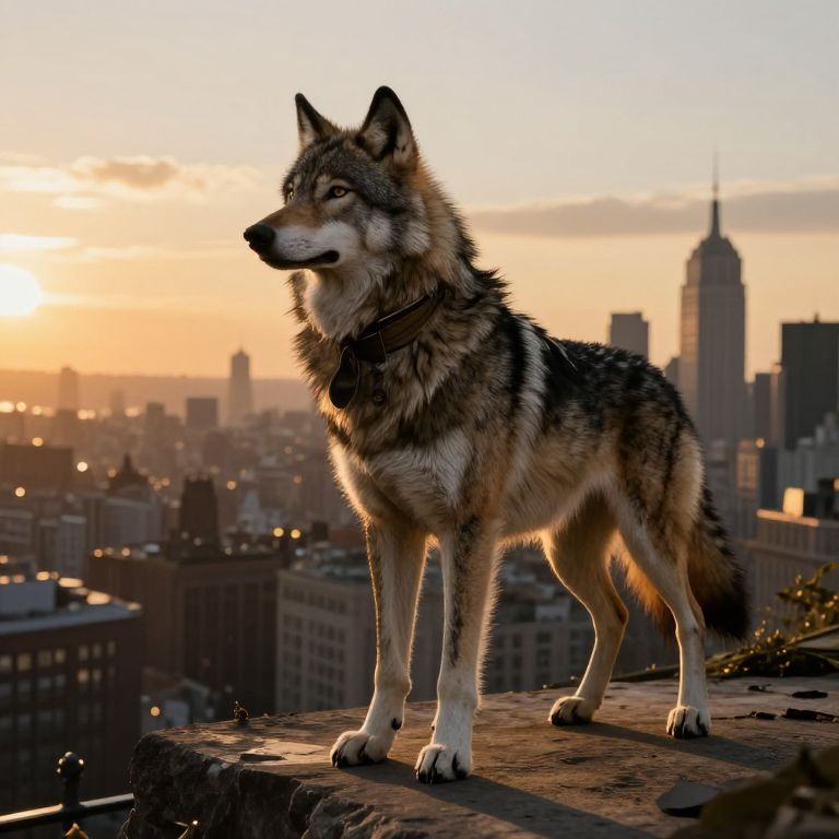 Picture an anthropomorphic wolf in Victorian attire, its fur seamlessly integrating with the fine threads of its clothing. This wolf stands at the edge of a cityscape, casting long shadows as dusk settles over the metropolis. The golden light of the setting sun bathes the scene, highlighting every curve and plane of the wolf's majestic form while also illuminating the bustling city below. From this vantage point, the transition from day to night is palpable, invoking a bittersweet sentiment that captures both the grandeur of urban life and the solitude of the wolf, creating an emotional tapestry for the viewer to explore.