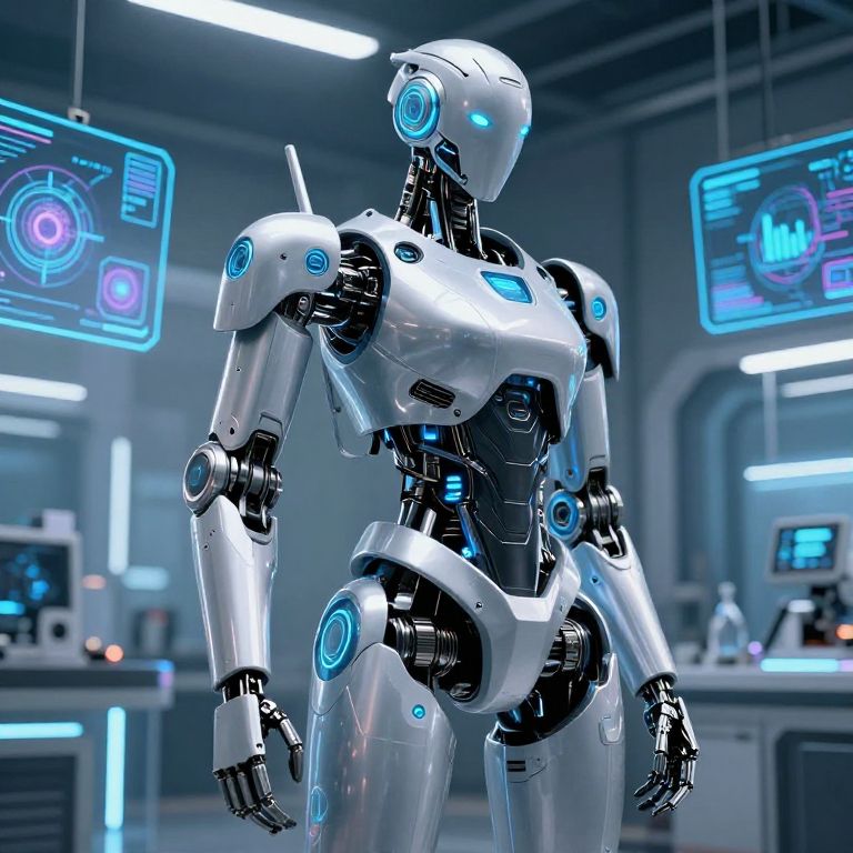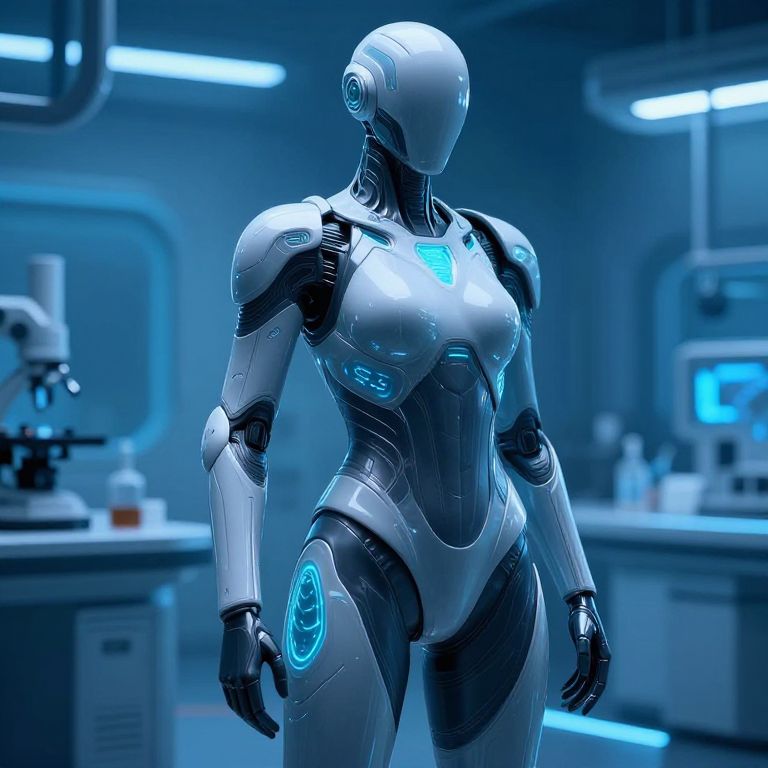 Sci fi suit integrated with bioluminescent elements, smooth textures blending metal and organic materials, standing in a futuristic lab, ambient blue lighting, concept art style