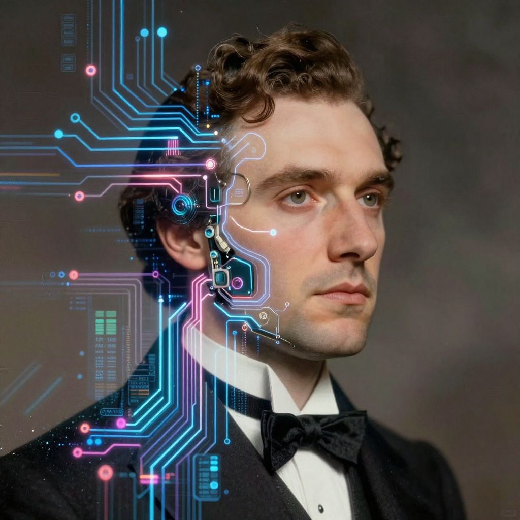AI art from picture transforming a vintage portrait into a futuristic cybernetic masterpiece, integrating neon circuitry, holographic textures, and ethereal light effects, evoking a blend of classical and sci-fi aesthetics.