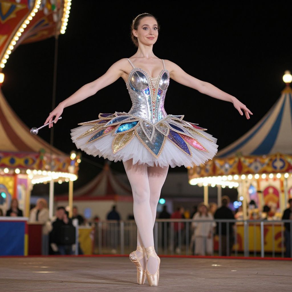 Photorealistic portrait of a tall, slender woman dressed as a circus ballerina with a futuristic tutu made of metallic sparkles and carnival-inspired fusion patterns, standing on a stage at a nighttime midway carnival, golden lights flickering above, her face is serene and elegant with wide eyes and a soft smile, wearing elegant ballet shoes with glimmering tips and holding a small silver baton in one hand.. The woman has big tits and cute face