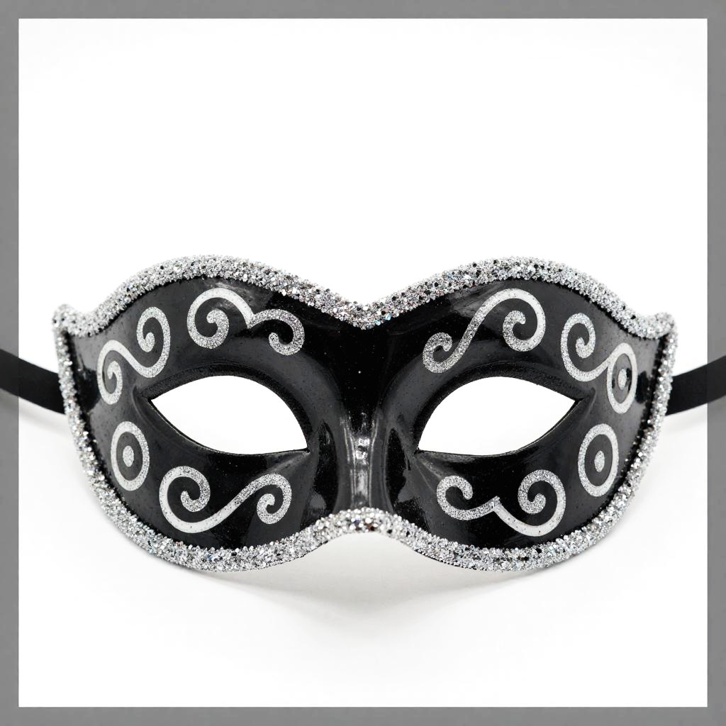 Photograph of a black masquerade mask with white, swirling patterns and glittery edges, set against a white background.