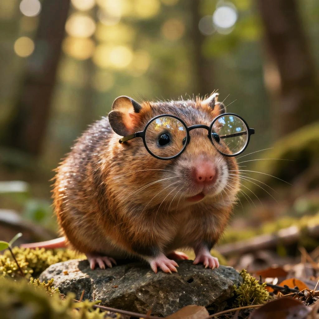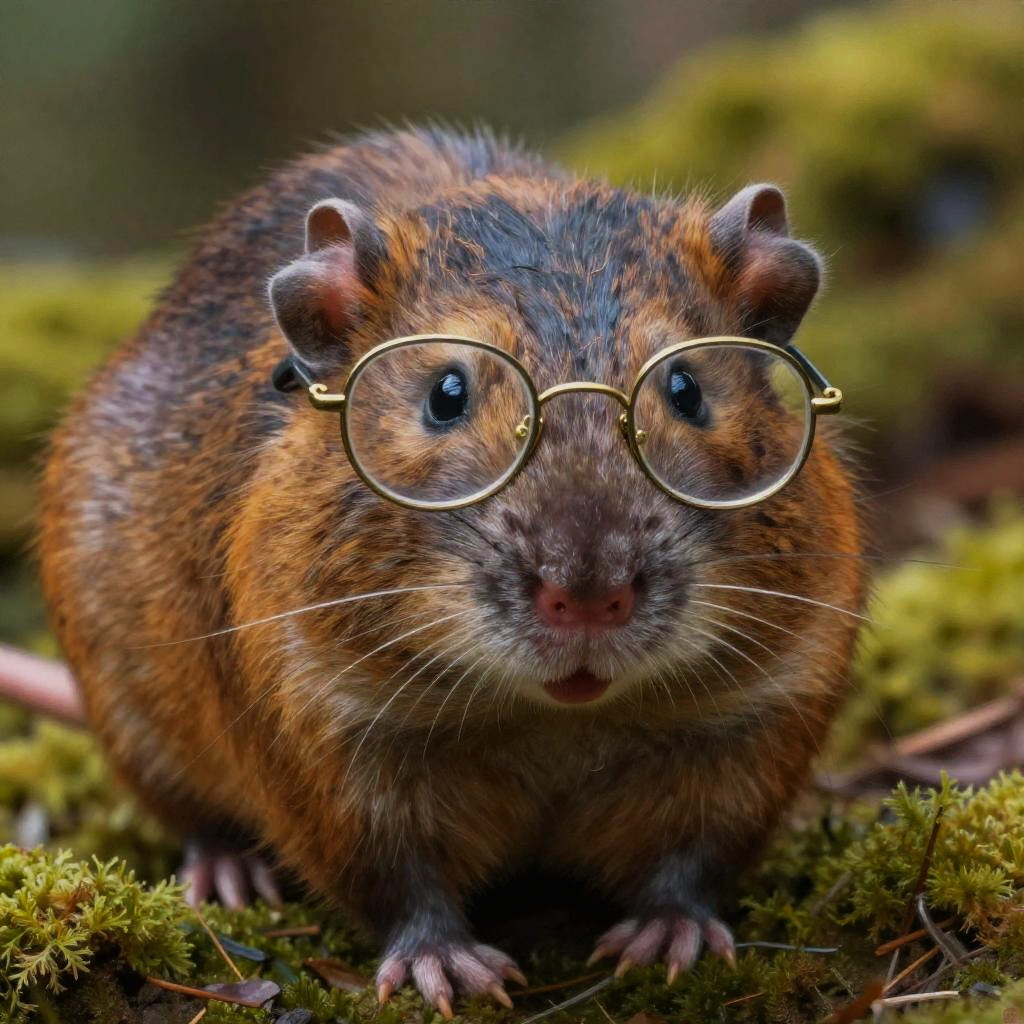 Close-up portrait of a mole rat with glasses, wearing vintage wireframe spectacles, against a soft-focus natural background of moss and soil, detailed and textured fur, a curious and scholarly expression, painted in a hyper-realistic style with natural colors.