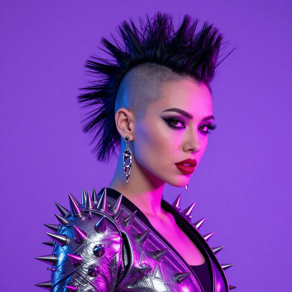 This striking image features a woman with a mohawk hairstyle and a futuristic, edgy look, highlighted by her metallic outfit adorned with spikes. The vibrant purple and neon background enhances the overall aesthetic, giving it a bold and artistic atmosphere.