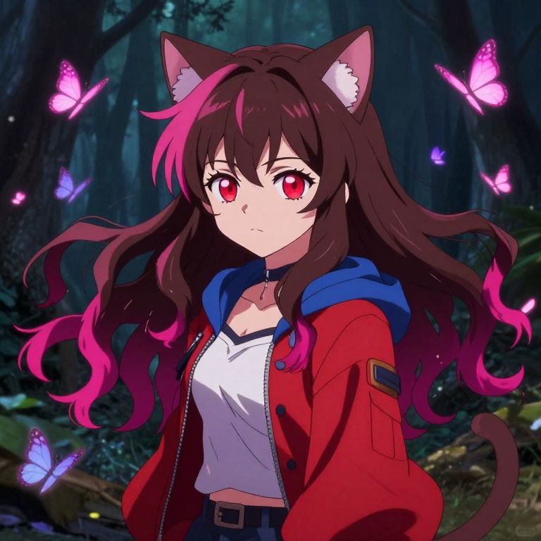 The image depicts an anime-style character with a Cheshire Cat theme, set against a dark, forest-like background. The character has long, wavy brown hair with pink highlights, adorned with cat ears and a tail. She is wearing a red jacket with a blue collar and a white top, giving her a playful yet adventurous appearance. The character's eyes are strikingly red, adding to her mysterious aura. Butterflies of various sizes and colors, including pink and purple, are scattered around her, enhancing the magical and whimsical atmosphere. The overall composition is dynamic, with the character positioned centrally, drawing the viewer's attention to her expressive face and vibrant attire. The interplay of light and shadow creates a sense of depth, while the contrasting colors of the character's outfit and the background elements add visual interest and depth to the scene.