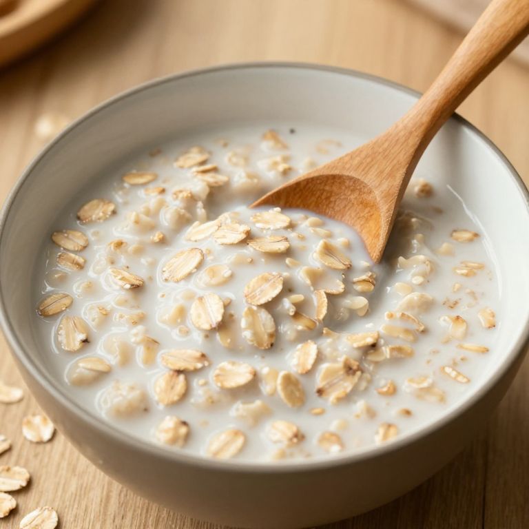 Photograph of a grey ceramic bowl filled with creamy white oat milk, topped with scattered, golden-brown oat flakes. A wooden spoon with a smooth texture rests in the bowl, slightly to the right. The bowl is placed on a light brown, wooden surface, with a few oat flakes scattered around. The background is softly blurred, focusing attention on the bowl. Natural light highlights the textures, creating a warm, rustic feel.