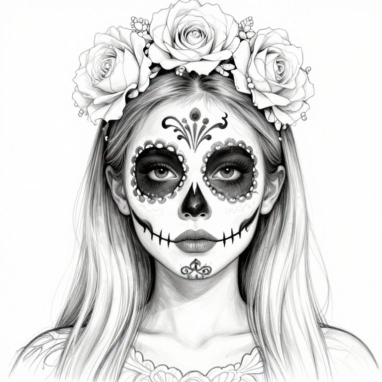 "Sullen Black and white Realistic outline sketch Beautifull Cute young Girl with Day of Dead style makeup, realistic face, ready for coloring on white background,"