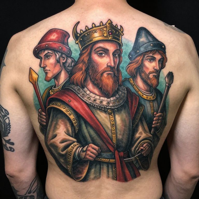 Medieval Portrait cartoony colorful new school tattoos, realistic, tattoo details, back tattoo, characters,