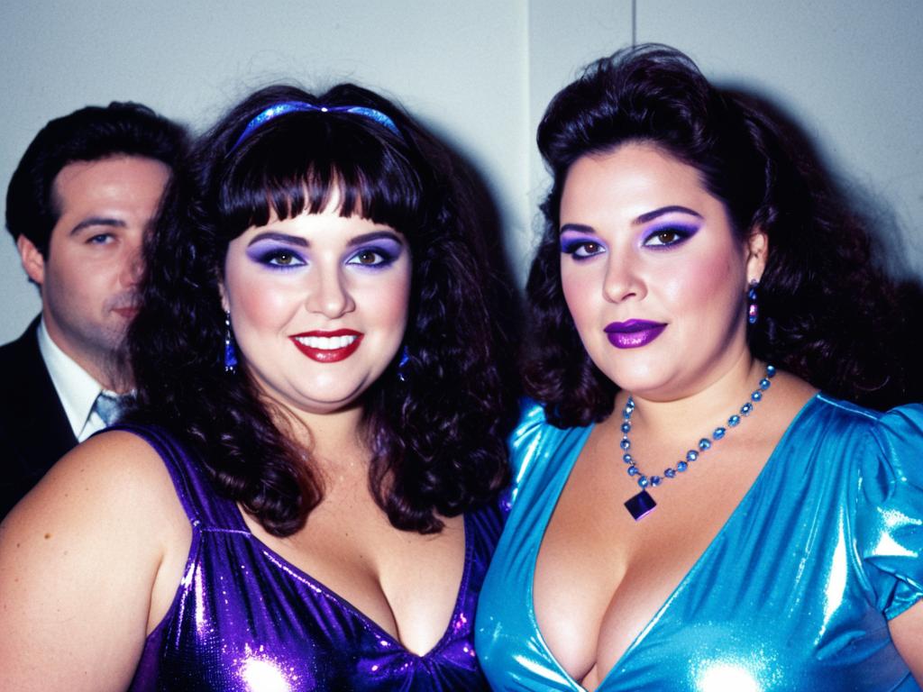 Plus Size 80s Pop Party face swap, a woman in a purple and blue shiny outfit