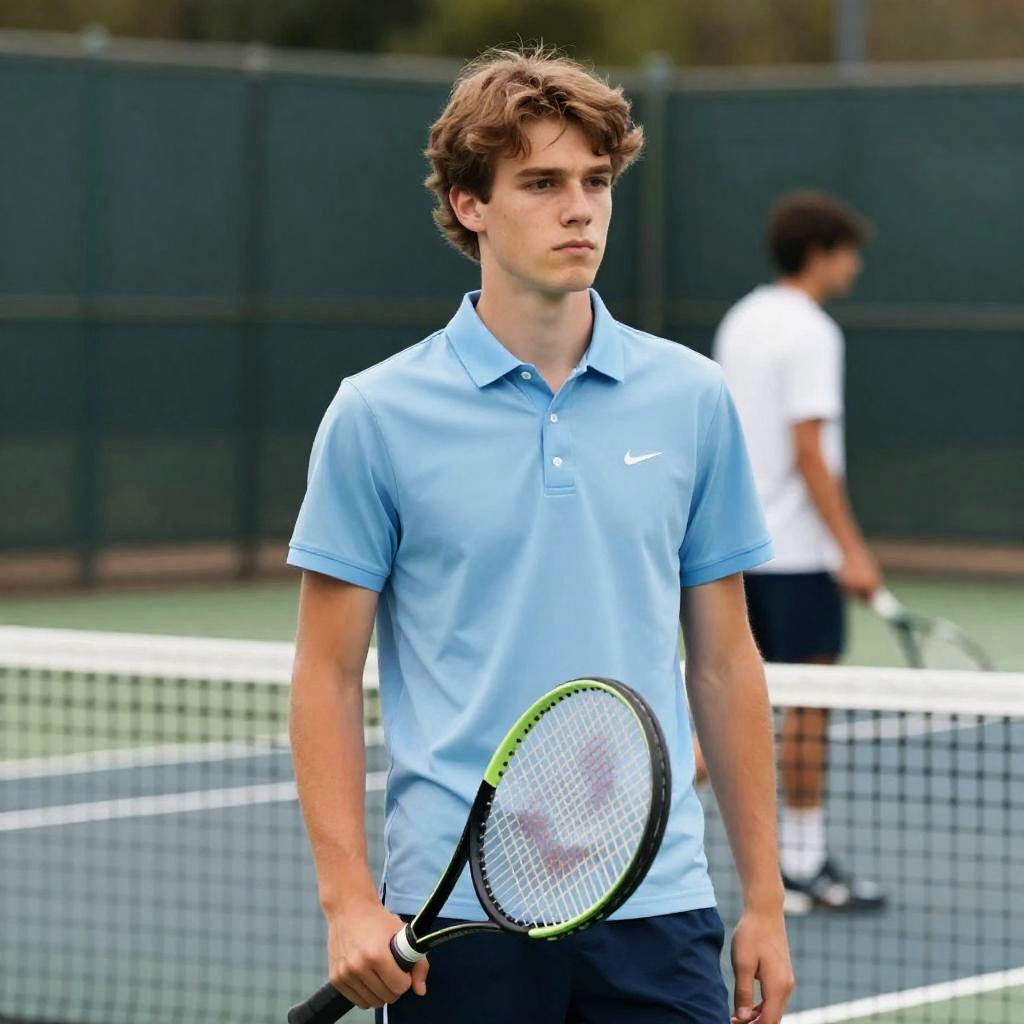 Male tennis player wearing white and red sportswear and a white headband, sitting on a grass tennis court with legs extended and looking down. The scene captures a professional tennis match with an umpire and ball boys seated in the background and a large crowd watching the game from the stands. The outdoor court is well-maintained with clearly visible white boundary lines.