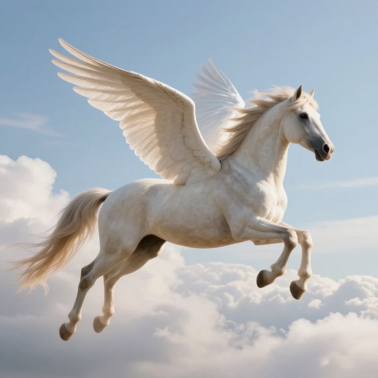 A majestic winged horse soars gracefully through a celestial realm of soft, billowing clouds, defying gravity with its ethereal beauty and mythical presence.