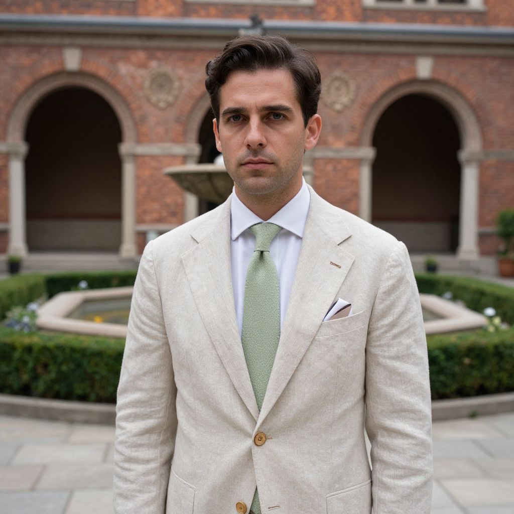 "a man, light beige linen suit, white cotton dress shirt, pastel green tie, tan suede loafers, minimalist pocket square, historic brick building, ornate archways, quiet courtyard garden, Holga camera style, contemplative expression. Man has masculine face and piercing eyes"
