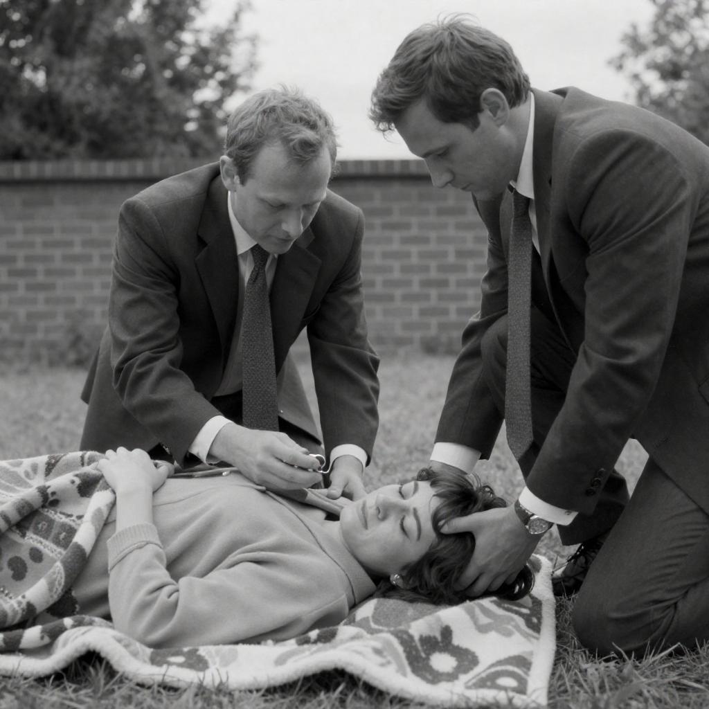 Black-and-white photograph of a group of seven people. Six women and one man surround a young woman lying on the ground. Women wear Victorian-style dresses and aprons, one with a lace collar. Man has dark hair, collared shirt. Young woman lies with eyes closed. Brick wall background. Cross-shaped structure in the back. Intense expressions on faces. Women's expressions show concern, man's expression neutral.
