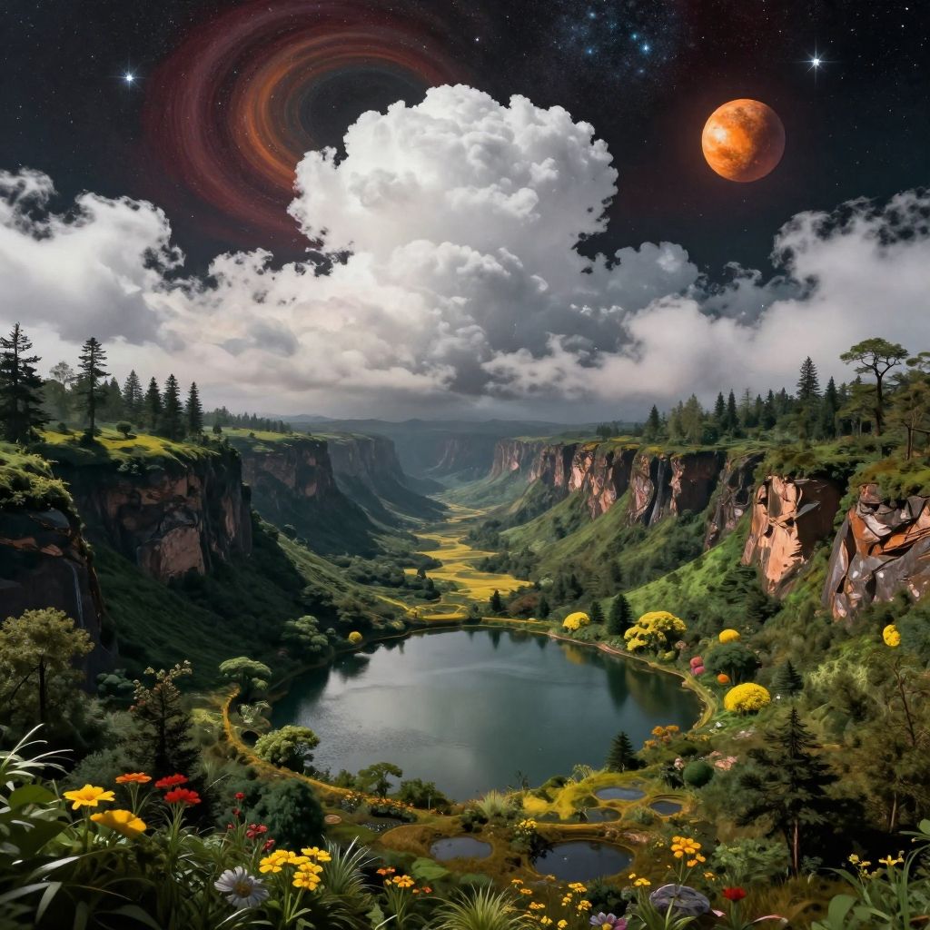 Art by mooncryptowow, psychedelic, <8k, high detail, uhd, sharp focus, palette, photorealistic, absurdres, extreme detail, as much detail as possible, extremely high visibility>, dark white, matte green, dark yellow, shiny orange, dark maroon, (a mesmerizing scenery of clouds and stars showing a natural landscape:1.3), celestial objects in a beautiful sky, pond, mountains, gorge, beautiful earth, flowers, puddles, deep forest, dusk, (rain:0.5), the most beautiful image in the world
