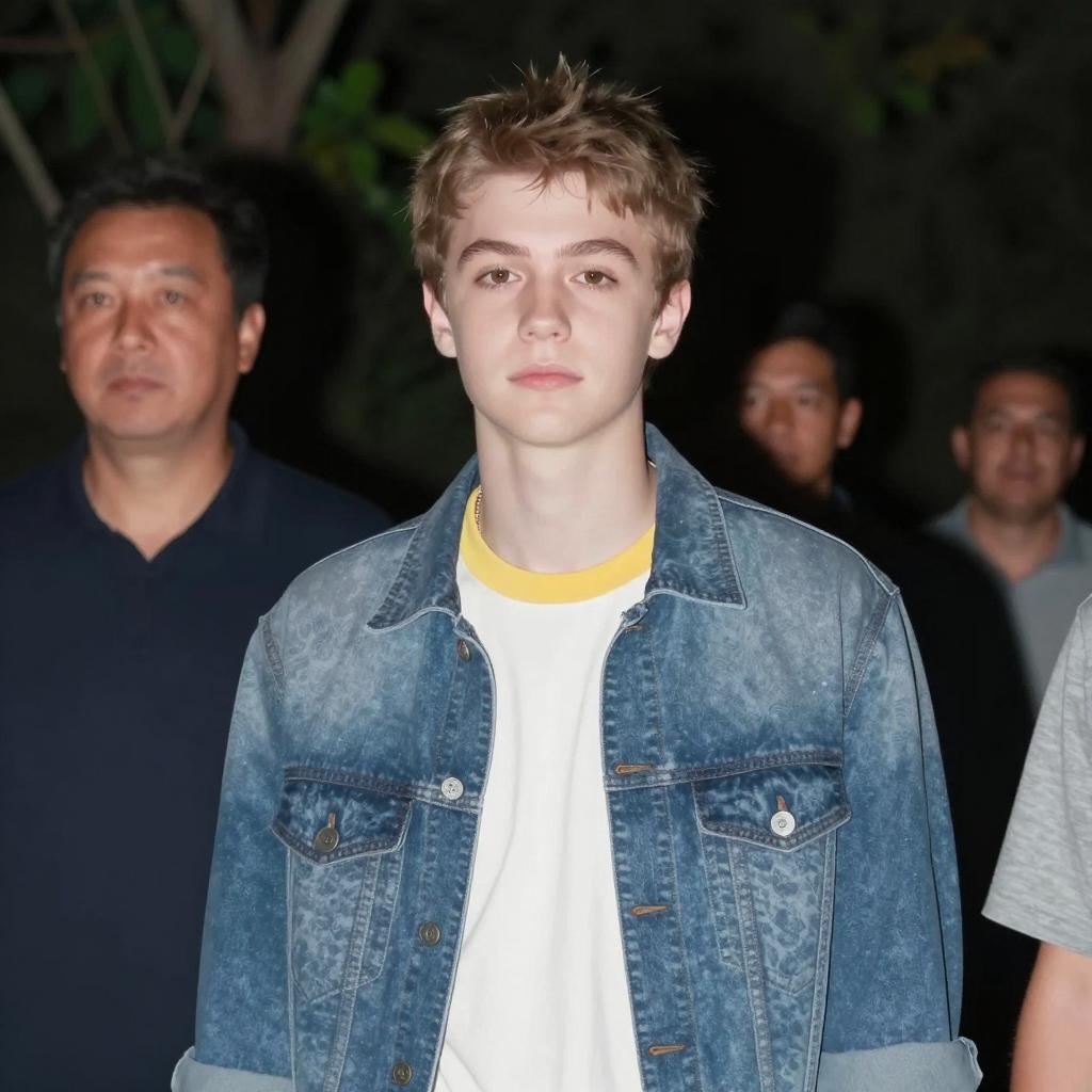 Young man with short, light brown hair, wearing a blue patterned shirt over a yellow and white t-shirt, stands in the foreground. He has a neutral expression. Another person with dark hair, in a dark shirt, stands to his left, slightly blurred. Background shows a dimly lit outdoor setting with several people and greenery.
