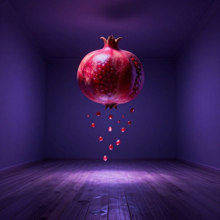 A surreal dreamscape depicting an expansive, vacant chamber with no discernible entrance or exit, observed from a vantage point above its gleaming wooden floorboards. At the room's heart floats a colossal pomegranate, defying gravity and seemingly supplanting the absent ceiling; its seeds cascade like droplets of rain, each metamorphosing into a miniature duplicate as they descend. The scene unfolds in a palette of deep indigo and violet hues, suffused with a soft, diffused light that emanates from an unseen source beyond the frame's edges. This ethereal illumination casts gentle shadows that dance across surfaces, imbuing the room with a sense of both wonder and unease as it floats adrift in liminal space.