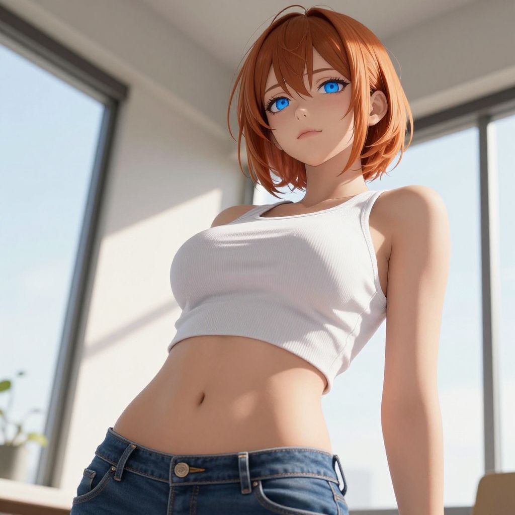A digitally illustrated woman with striking blue eyes and short auburn hair is depicted from a low angle, emphasizing her curvy figure. She wears a tight, white ribbed crop top and blue jeans, bathed in warm natural sunlight streaming through large windows, showcasing a modern anime art style.