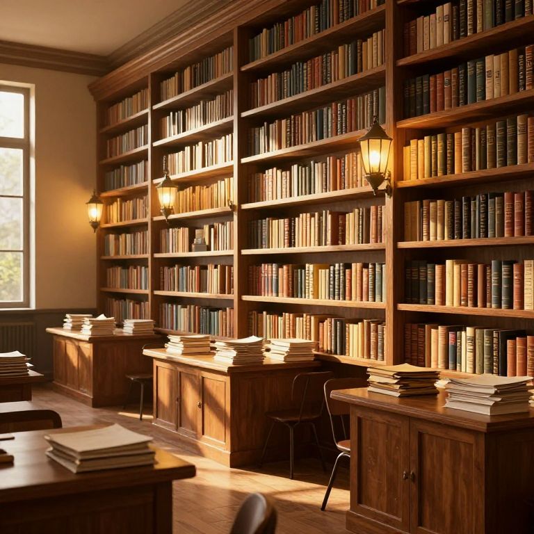 An atmospheric 3D-rendered library bathed in golden-hour sunlight, featuring rows of wooden bookshelves filled with books, punctuated by vintage-style lanterns and desks cluttered with stacks of papers, evoking a serene, timeless ambiance where knowledge whispers silently amidst the stillness.