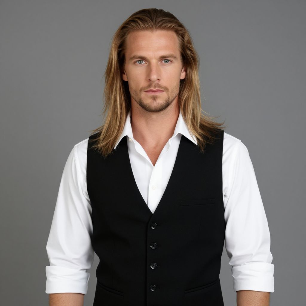 A man with long blonde hair is wearing a white shirt with a black vest over it.