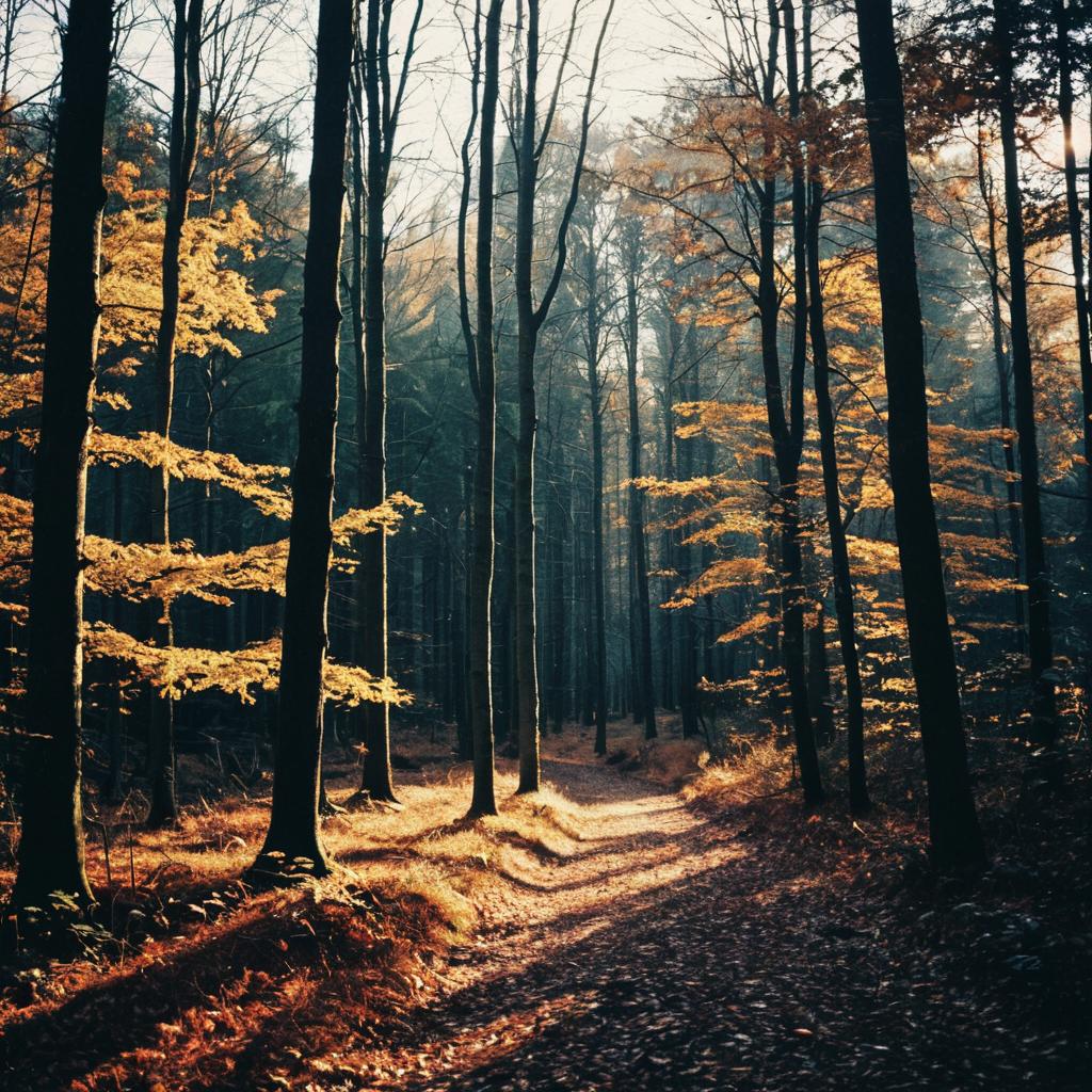Scenic autumn forest with a sunlit path winding through tall trees. The warm afternoon light highlights yellow and orange leaves, creating a serene and peaceful atmosphere in this natural woodland setting.