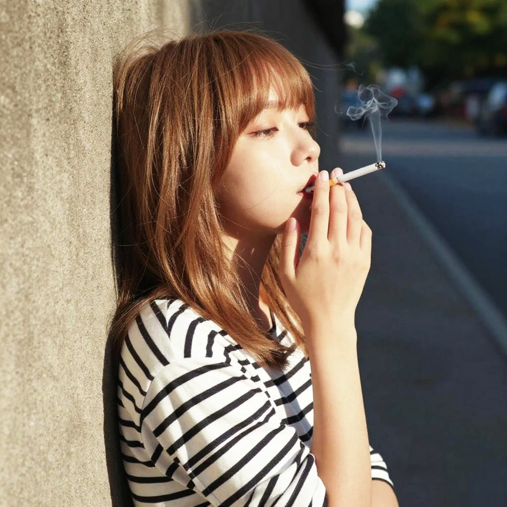 Photograph of a young Asian woman with brown hair, wearing a striped shirt, smoking a cigarette against a sunlit concrete wall.