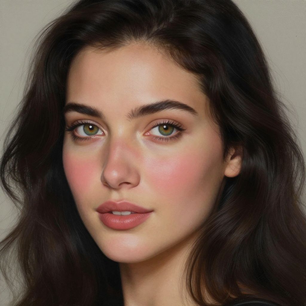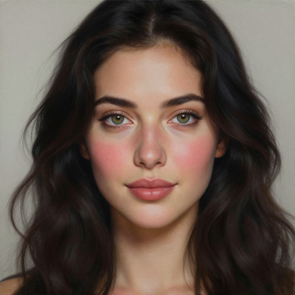 Photorealistic portrait of a young woman with long, wavy dark brown hair, green eyes, pink blush, and neutral pink lips, set against