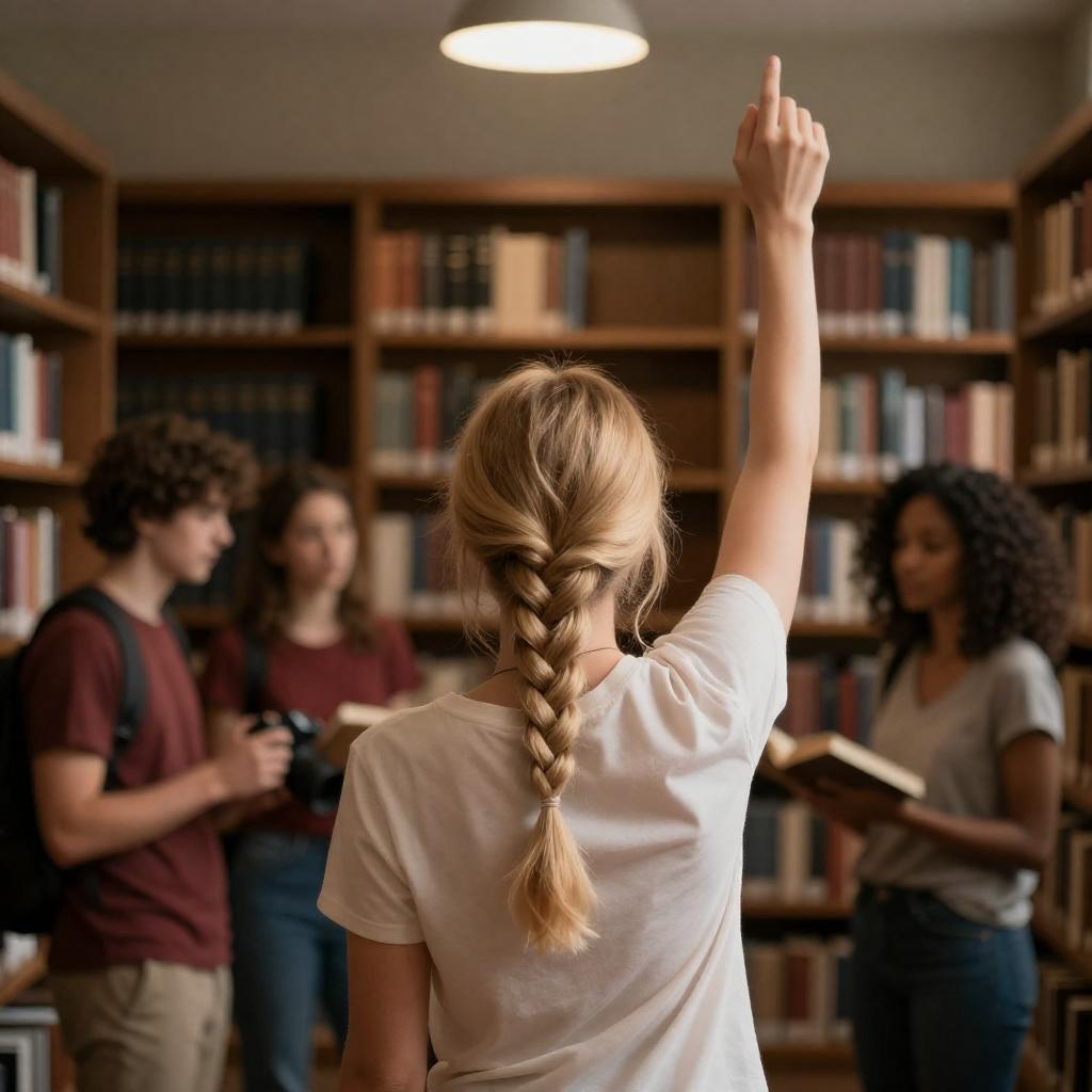 Photograph of a person with a hood up, facing away, wearing a grey hoodie and teal backpack. Background includes a yellow school bus on the left, white building with a flat roof in the center, and a white truck on the right. Yellow road sign with black arrow on the right. Dry grass and trees under a clear blue sky. Mountains in the distant background.