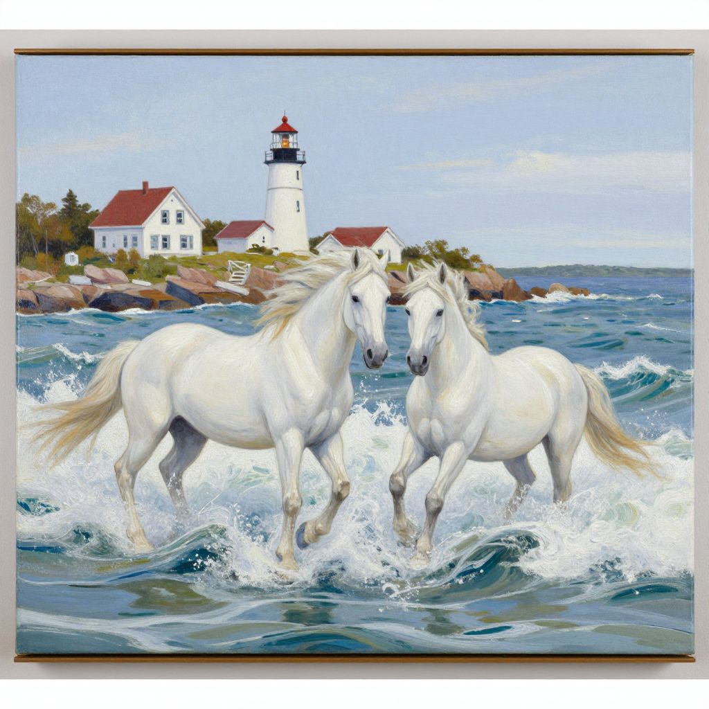 Digital painting of three white horses galloping through waves, with a lighthouse and white house in the background. Bright, vivid colors.