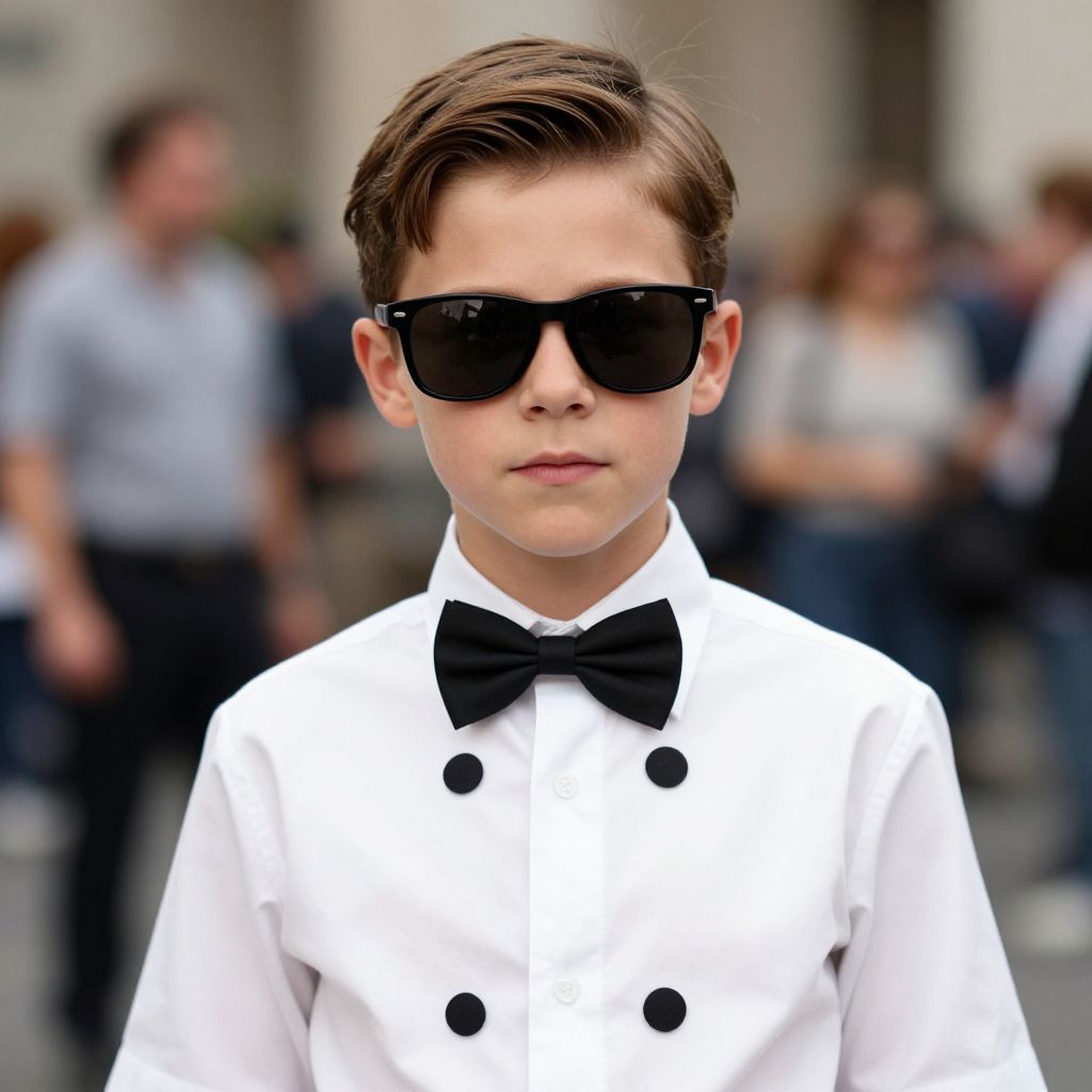 Austin powers movie costume, 1boy, male focus, solo, sunglasses, bow, bowtie, brown hair, blurry background, blurry, looking at viewer, upper body, polka dot, shirt, closed mouth