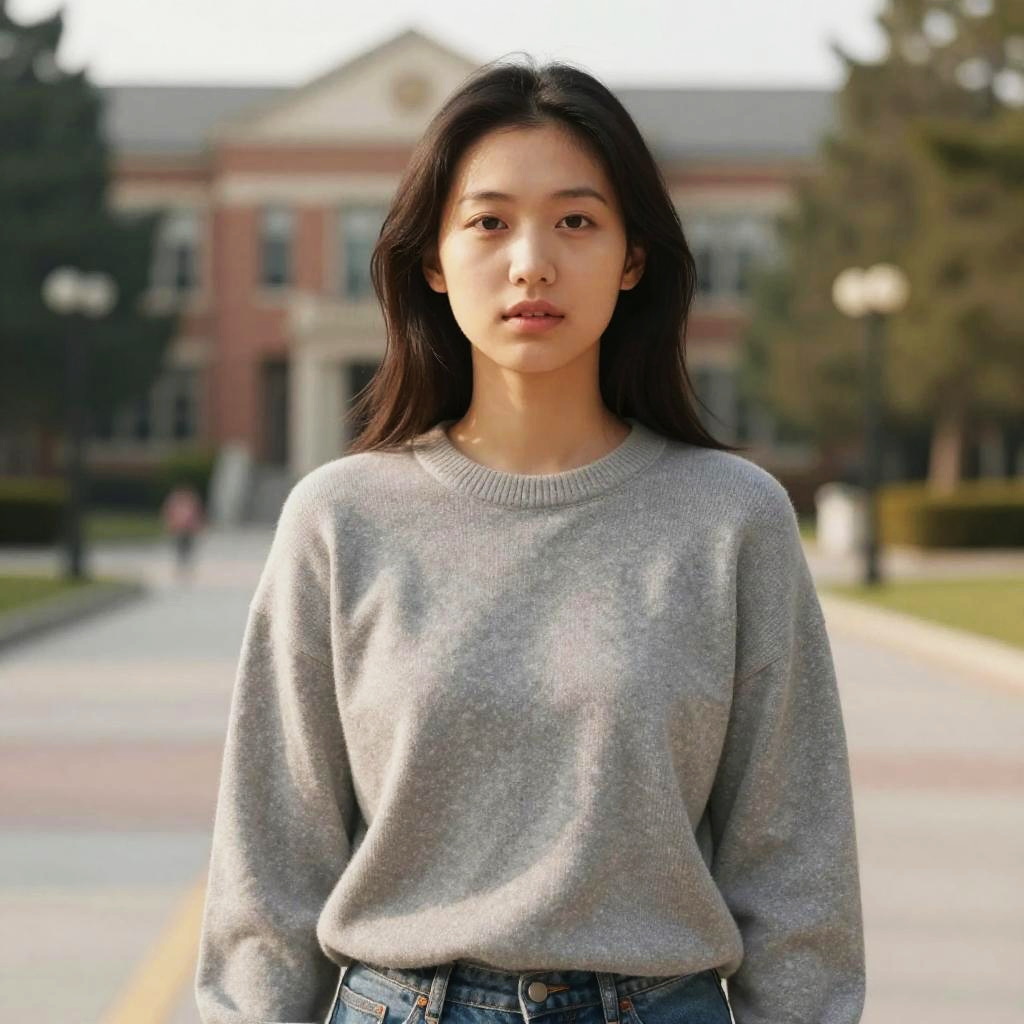 Photograph of an Asian woman with long black hair, standing outdoors in front of a blurred brick building with white columns. She has a neutral expression and is wearing a light gray, slightly oversized, knit sweater with blue jeans. The background includes a pathway, lampposts, and trees, with sunlight casting soft shadows. Her skin is smooth and she has subtle makeup. The image has a shallow depth of field, focusing on her face and upper body while the background is out of focus. The overall style is natural and candid.