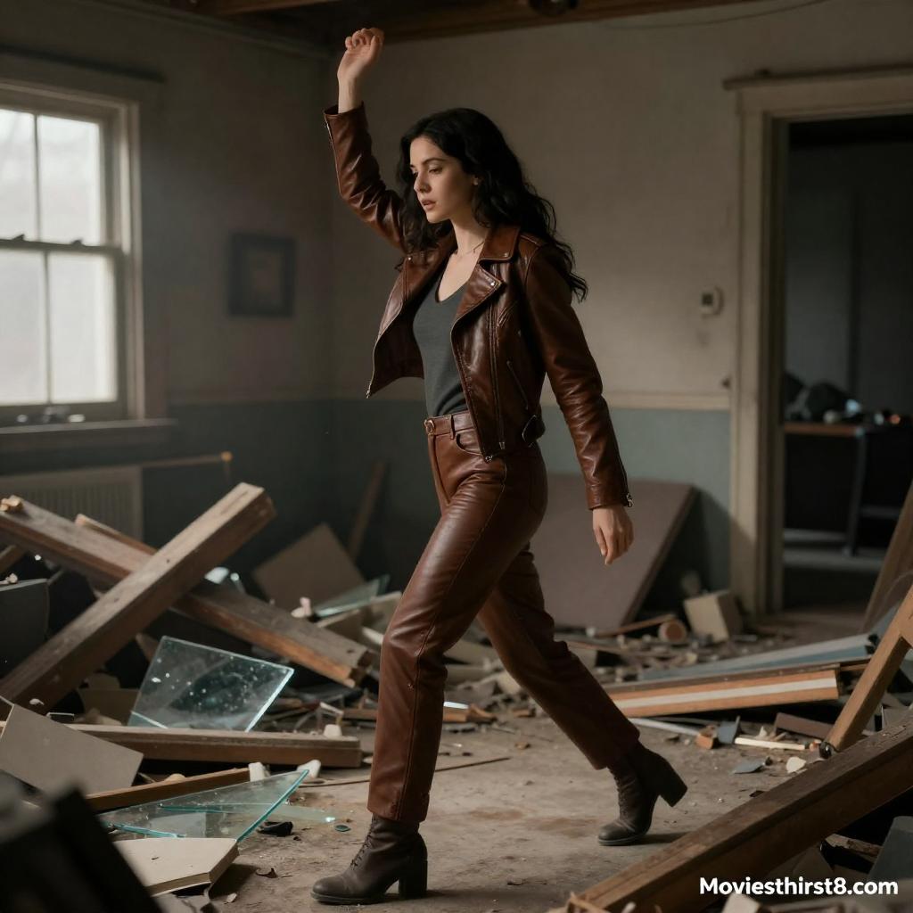 Photograph of a woman with long dark hair, wearing a brown leather jacket and matching pants, standing amidst a chaotic, debris-filled room. She is mid-stride, with one arm raised, surrounded by broken wooden beams, shattered glass, and scattered objects. The background includes a partially visible window and a cluttered, dilapidated interior. A "Moviesthirst8.com" is in the bottom right corner.