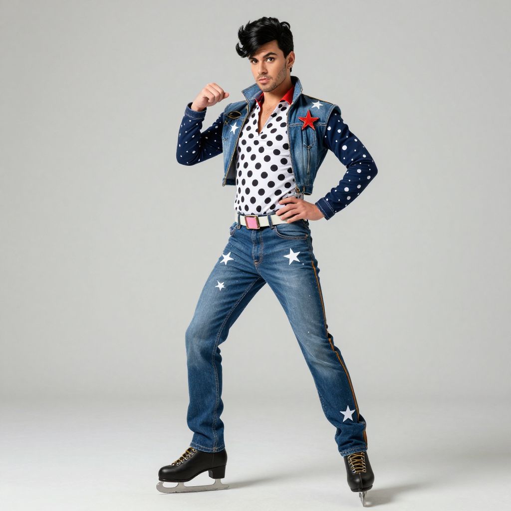 Star dance costume, 1boy, male focus, solo, pants, jacket, facial hair, full body, polka dot, denim, shoes, standing, jojo pose, parody, shirt, hand on own hip, jeans, belt, polka dot shirt, ice skates, black hair