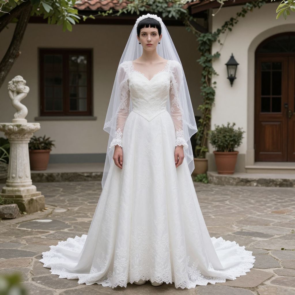 Modern Bride Frankenstein Costume, dressed in a wedding dress and veil standing in a courtyard