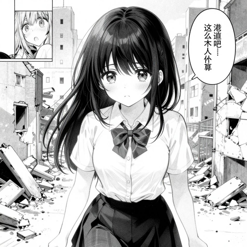 Black-and-white manga-style drawing: lone girl in school uniform stands amidst rubble, surrounded by damaged, towering urban buildings, with debris scattered on the ground