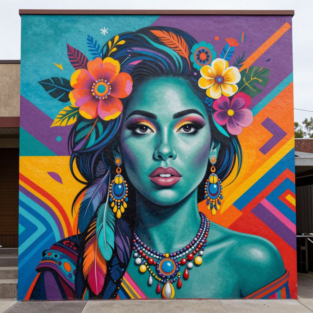 This digital artwork features a striking portrait of a woman with teal-green skin, adorned with vibrant, colorful feathers and flowers in her dark, voluminous hair. She wears intricate jewelry, including large, dangling earrings and a necklace with a central blue gem. Her makeup is bold, with dark eyeliner and pink lips. The background is a vivid, abstract mix of orange, yellow, pink, and blue patterns, including geometric shapes and a circular design. The woman's expression is calm and confident, and the overall style combines elements of realism and vibrant, contemporary street art, creating a visually captivating and culturally rich image.