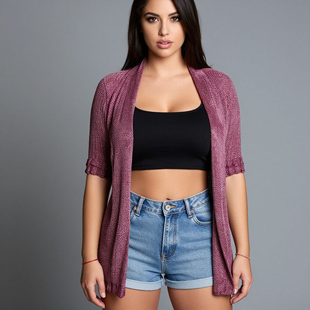 Woman, casual chic, marled knit open-front cardigan with draped silhouette, short sleeves, black crop top, high-waisted denim shorts, thin red beaded bracelet, grey studio background. Sexy. Pretty face and beаutiful eyes. Big breasts.