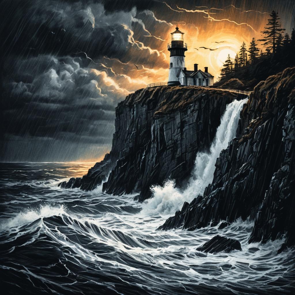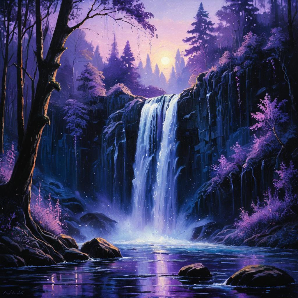 A waterfall in a tropical rainforest, water cascading in misty sheet cascades, soft diffused sunset, impressionistic oil painting