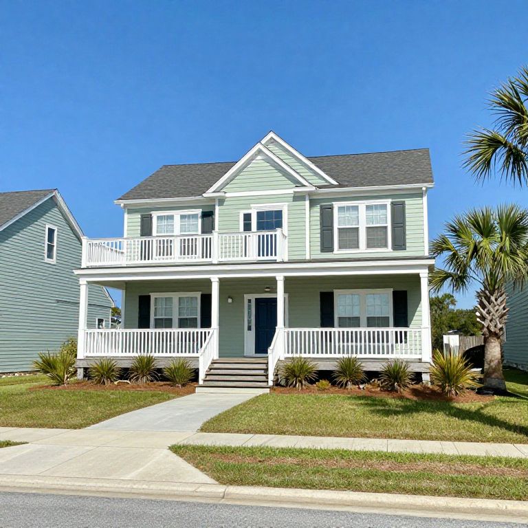 Photograph of a two-story, light green, beach-style house with white trim and a dark gray shingled roof. The house features a large, covered front porch with white railings and a central staircase with three steps leading to the front door. There are two windows on the second floor and three on the first. The house is surrounded by a well-maintained lawn with small shrubs and a concrete driveway. To the right, a tall palm tree stands beside the house. The sky is clear and bright blue. Another similar house is partially visible on the left.