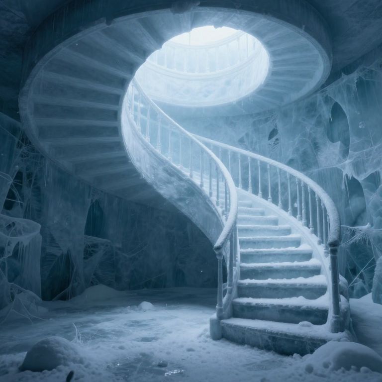 Ascending an infinite spiral staircase, each step a portal to a frozen dimension, the journey becomes a meditative ascent toward an otherworldly serenity, where the silence echoes with the weight of eternity and the promise of transcendence.