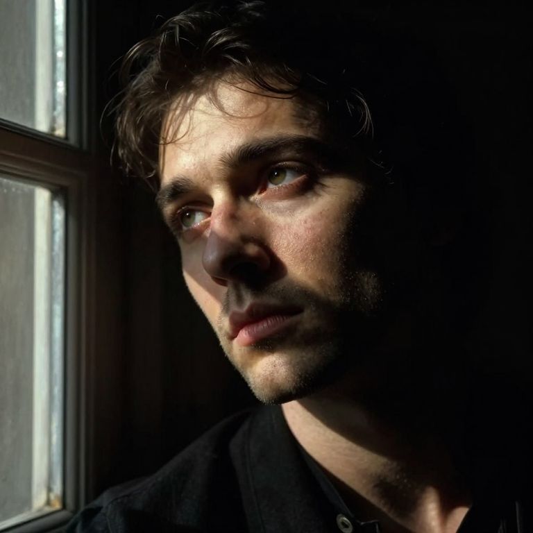 Photograph of a Caucasian man with wavy, dark brown hair and fair skin, lit by sunlight from a window on the left. His face is partially shadowed, highlighting his deep-set eyes, slightly parted lips, and subtle stubble. He wears a black shirt, and the light creates a dramatic contrast, accentuating his facial contours. The background is dark, with the window casting a bright, rectangular light patch on his face. The image has a high-contrast, almost moody atmosphere, emphasizing the man's introspective expression.